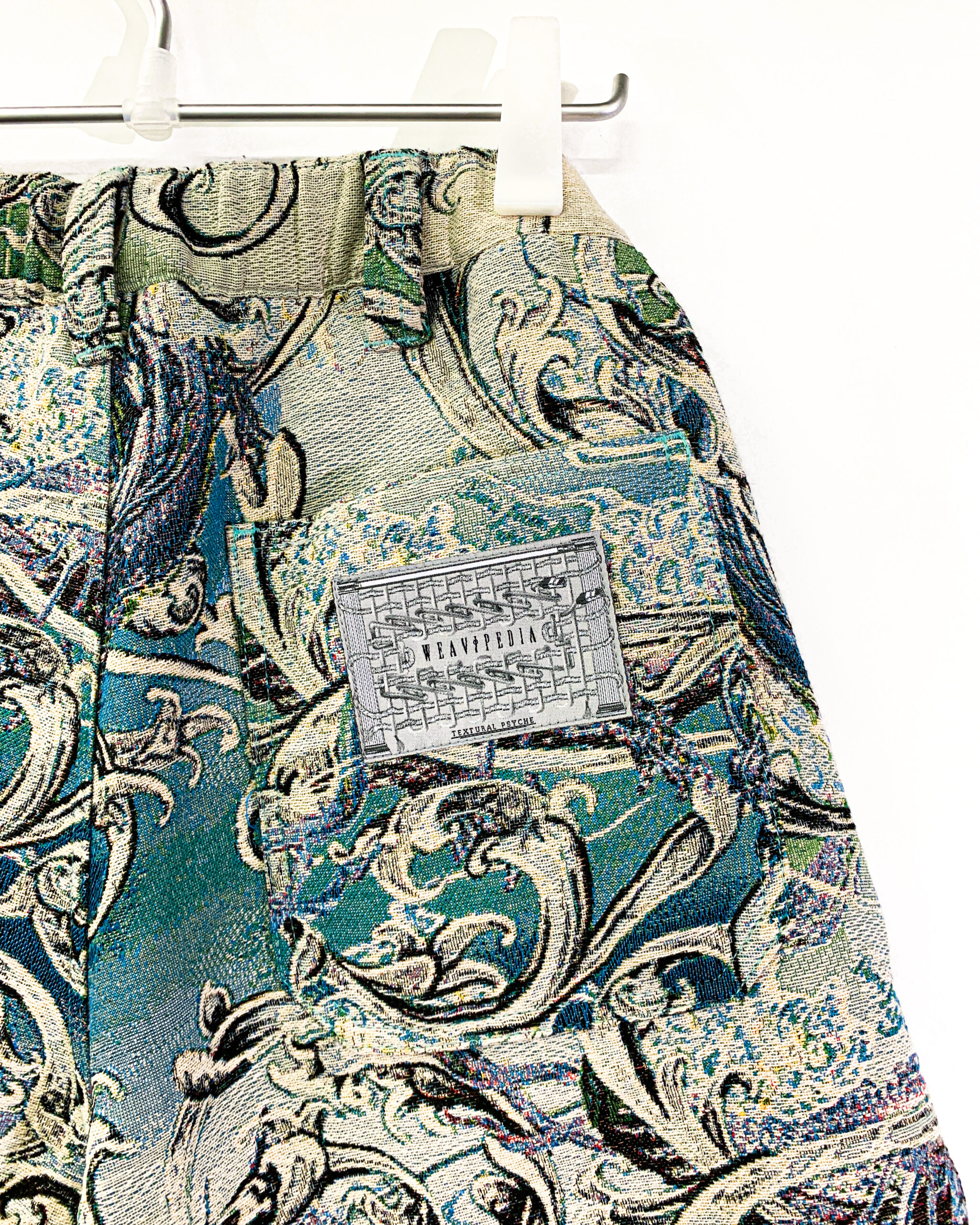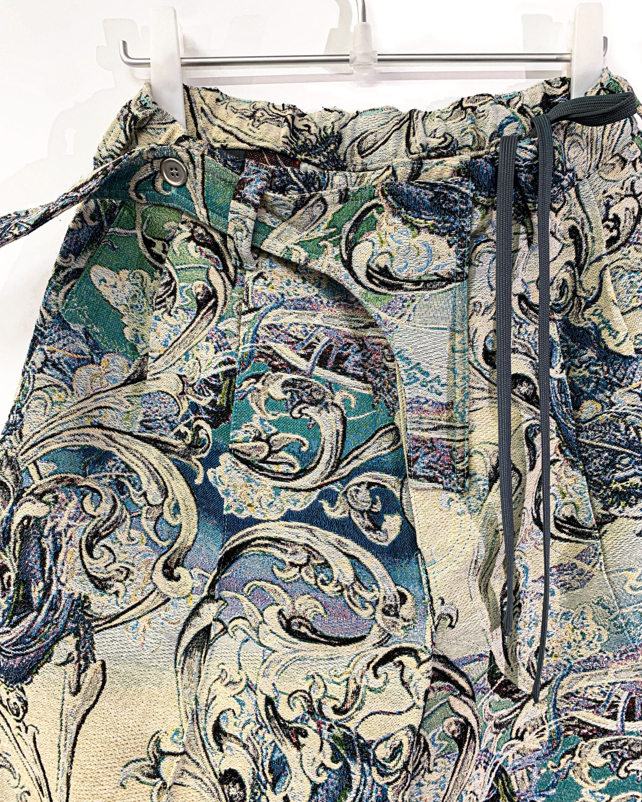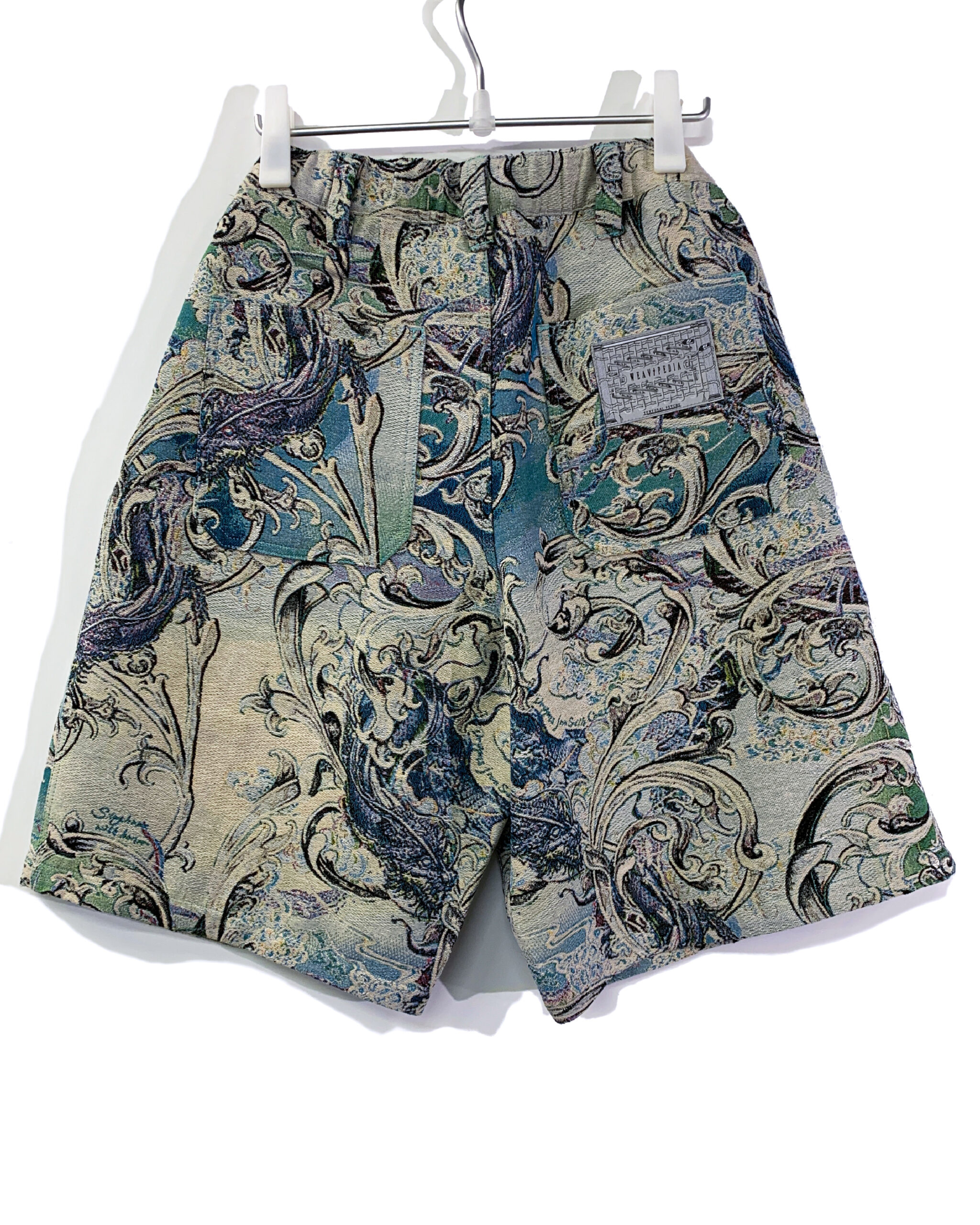 Wide shorts with tapestry jacquard in jade green and yellow. Custom-made tapestry jacquard mixed with dragons & western ornament. Long cords at the left and placket at the opening.