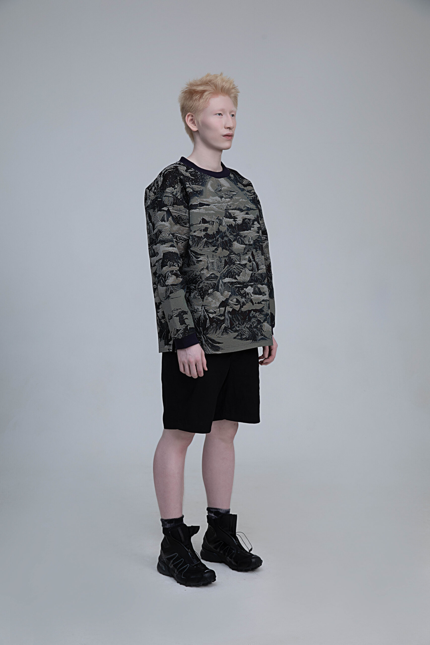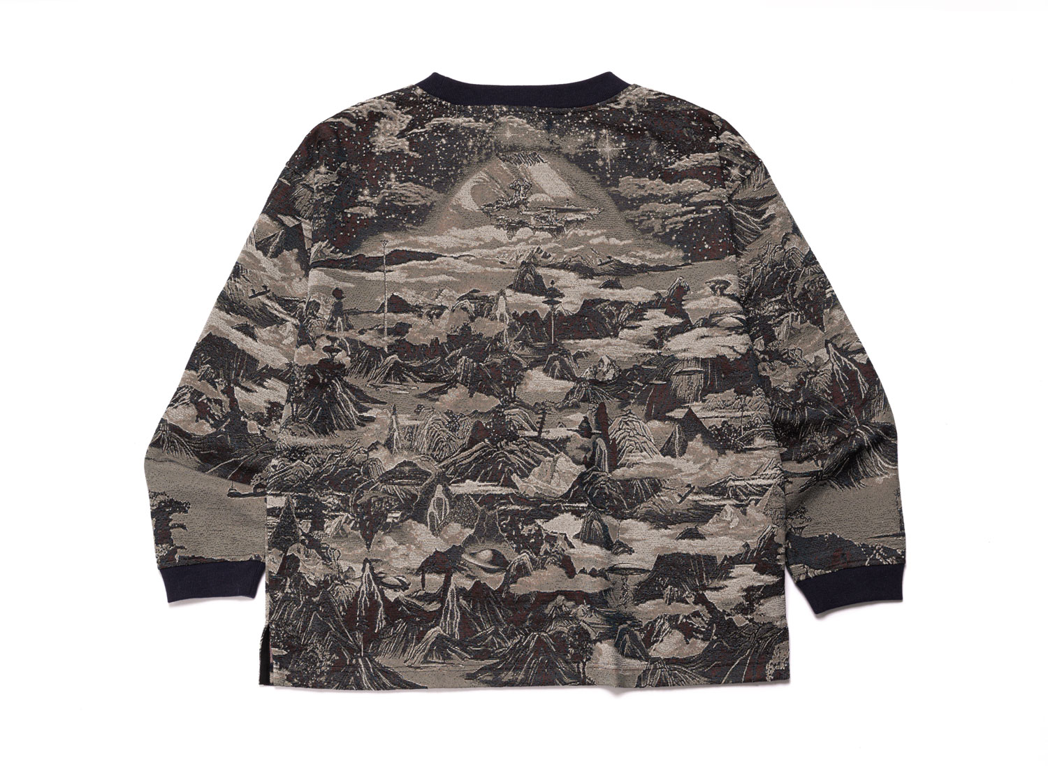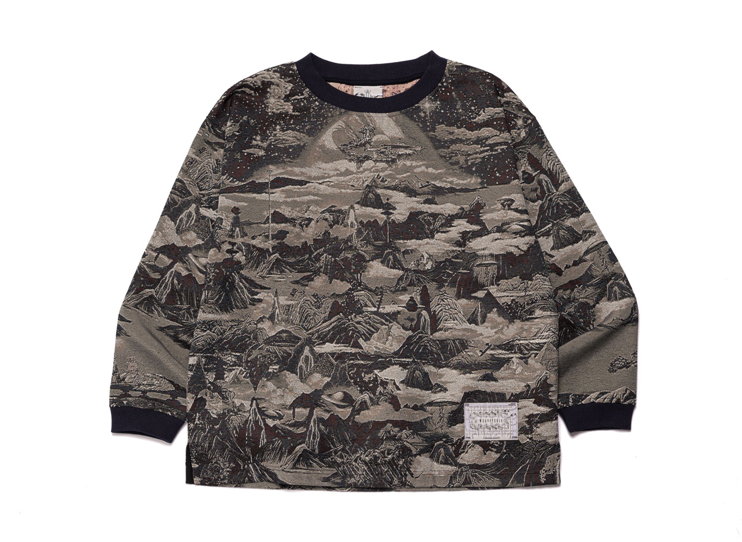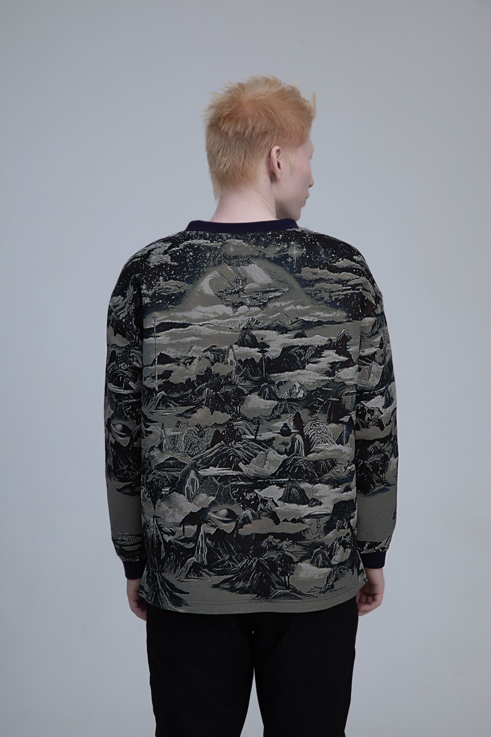 Long sleeve woven polyester-blend pullover in navy. Custom-made landscape painting mixed with UFO graphic pattern tapestry in navy and cream throughout. Rib knit crewneck collar and cuffs.